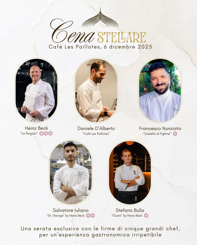 Pescara, 4 Dicembre 2025 – Cena stellare a Café Les Paillotes, sabato 6 dicembre. Una serata esclusiva con le firme di cinque grandi chef, per un’esperienza gastronomica irripetibile. Un viaggio nei sapori firmato dagli chef Heinz Beck, tre stelle da La Pergola, il più celebre ristorante di Roma, Daniele D’Alberto resident chef del pescarese Café Les Paillotes, definito “tra le migliori espressioni della nuova generazione di chef abruzzesi”, Francesco Nunziata, una stella conquistata al Castello di Fighine sulle colline toscane, Salvatore Iuliano, due stelle, direttamente dal St. George Restaurant by Heinz Beck di Taormina, e Stefano Bulla, una stella al Gusto by Heinz Beck a Quinta do Lago in Portogallo. Un mix di visione, tecnica e sensibilità che prenderà forma in una serie di piatti pensati per emozionare e conquistare già al primo sguardo.