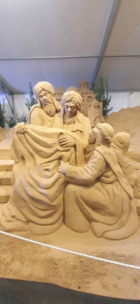 Il fulcro del Villaggio è senz’altro il monumentale Presepe di Sabbia. L’edizione 2025/26, intitolata “Kolossal… l’Arca di Noè”, è la più grande finora realizzata, estendendosi su circa 700 mq di spiaggia interamente al coperto. L’opera è il frutto della maestria di otto scultori internazionali—cinque donne e tre uomini provenienti da Spagna, Russia, Bulgaria, Bielorussia e Italia—che hanno dato forma ai grandi gruppi scultorei utilizzando esclusivamente sabbia e acqua. Le rappresentazioni includono scene bibliche imponenti, come l’Arca di Noè, l’Arcangelo Michele alto 5 metri e una Natività di oltre 5 metri ispirata al ‘Tondo Doni’ di Michelangelo Buonarroti, affiancate da elementi simbolici locali quali il borgo di San Giuliano e il Ponte di Tiberio. L’arrivo dei Re Magi è raffigurato sulla barca in arrivo davanti al Ponte di Tiberio. Le visite al Presepe sono accompagnate da personale che darà dettagli sia tecnici sulla costruzione che tematici sulle sculture. L’accesso è previsto nei giorni feriali (10:30 – 12:30 e 14:30 – 18:30) e con orario prolungato nei festivi, prefestivi e durante il periodo clou dal 24 dicembre al 6 gennaio (09:30 – 19:00), con aperture serali con spettacolo musicale in alcune date selezionate.