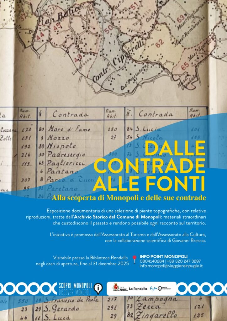 Il progetto “Alla scoperta di Monopoli e delle sue contrade”, così come questa esposizione, trae ispirazione dal volume di Giovanni Brescia, Oltre le mura. Storia e Atlante delle contrade di Monopoli (2025), un prezioso strumento per approfondire una storia fatta di mappe, voci e territori. Un sentito ringraziamento è rivolto all’autore per la collaborazione scientifica offerta; il volume è inoltre disponibile per il prestito presso la Biblioteca Rendella.