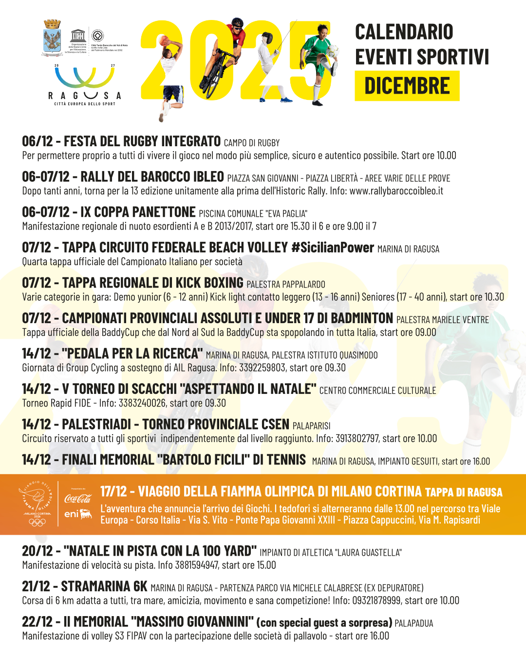 La ricchezza della proposta sportiva di dicembre testimonia la vivacità del movimento sportivo ragusano: dagli sport di squadra alle discipline individuali, passando per attività giovanili, iniziative solidali e manifestazioni aperte a tutta la cittadinanza. La grafica informativa consultabile sui canali istituzionali, e l’elenco di tutti gli eventi sul sito ragusawelcome.com, offrono una panoramica completa, permettendo a tutti di scegliere e programmare la propria partecipazione.