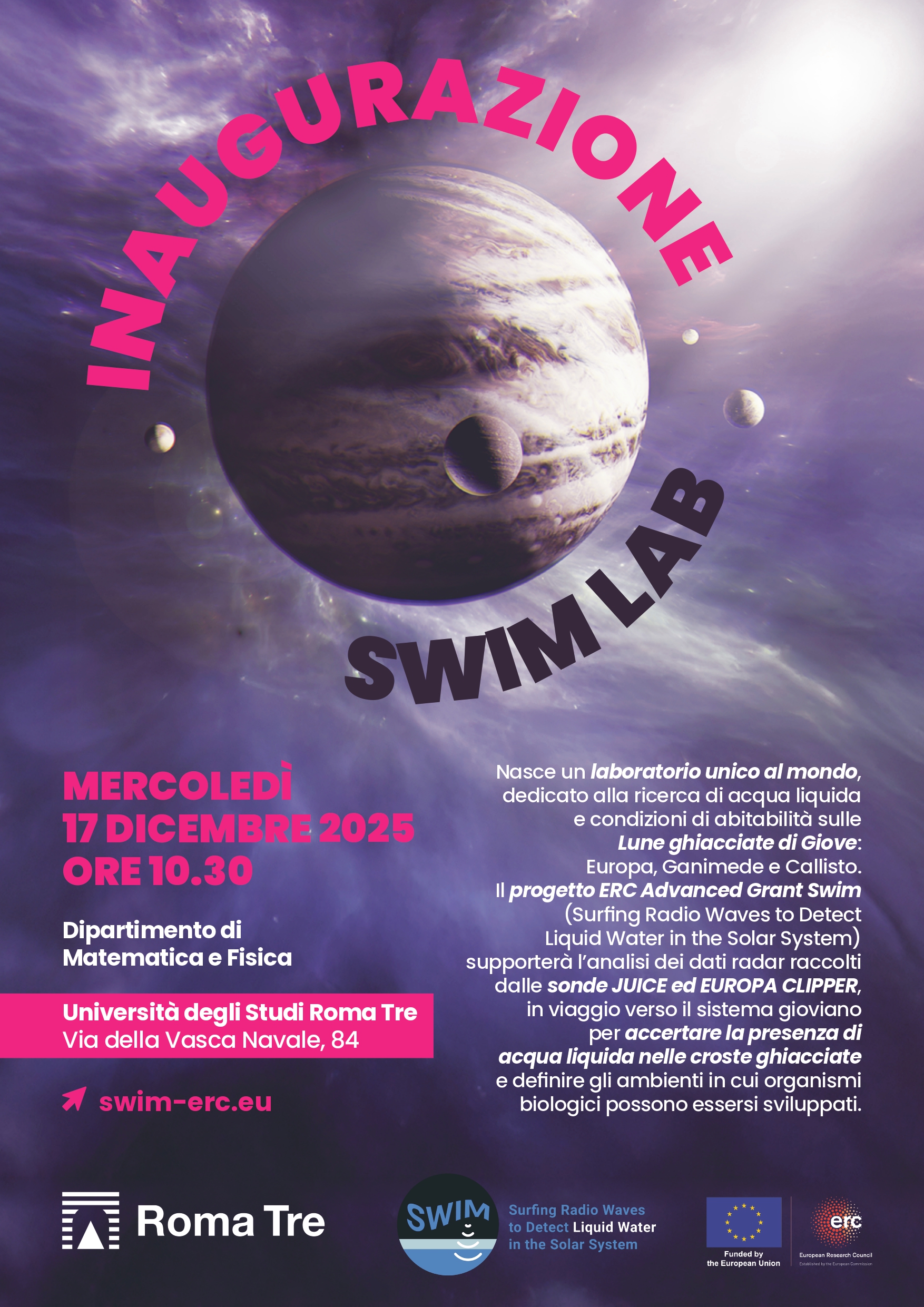 (AGENPARL) - Roma, 10 Dicembre 2025(AGENPARL) – Wed 10 December 2025 SWIM Lab nasce come un laboratorio dedicato alla ricerca extraterrestre di acqua liquida e di ambienti adatti alla vita per come la conosciamo. Il laboratorio è parte del progetto ERC Advanced Grant SWIM (Surfing Radio Waves to Detect Liquid Water in the Solar System) di cui la prof.ssa Elena Pettinelli è responsabile, finalizzato al supporto dell’analisi dei dati radar raccolti dalle missioni spaziali JUICE ed Europa Clipper, attualmente in viaggio verso le lune di Giove Europa Ganimede e Callisto, e che permetteranno di rilevare l’acqua nelle croste ghiacciate e gli ambienti potenzialmente favorevoli allo sviluppo di organismi biologici.