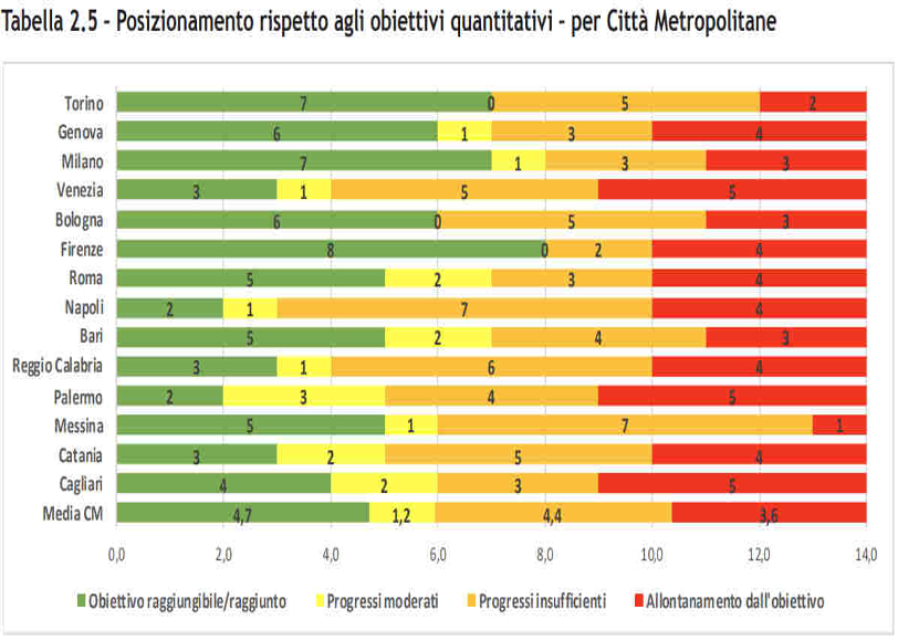 Le città Metropolitane. Un quadro altrettanto disomogeneo emerge nelle Città metropolitane. Le situazioni più favorevoli si osservano a Torino, Milano, Bologna e Firenze, in grado di conseguire il 43% degli obiettivi analizzati. Lo scenario peggiora quando si considerano i target che non verranno né raggiunti né avvicinati: con l’eccezione di Milano e Firenze, che restano comunque al 43%, tutte le altre Città metropolitane mostrano andamenti negativi o progressi insufficienti per almeno la metà degli obiettivi. Particolarmente critiche le condizioni di Venezia, Napoli e Reggio Calabria, dove la quota di obiettivi non raggiungibili supera il 70% (vedi tabella 2.5).
