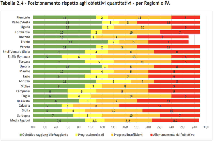 Il quadro delineato è estremamente preoccupante: si confermano le storiche distanze tra Nord e Sud, ma emergono nuove disuguaglianze anche all’interno delle singole aree, con interessanti segnali di dinamicità in alcune regioni meridionali e arretramenti in zone settentrionali. Tra le realtà più avanzate figurano la Provincia Autonoma di Trento, la Valle d’Aosta, la Liguria e l’Umbria, per le quali appare realistico il conseguimento di circa il 43% degli obiettivi considerati.