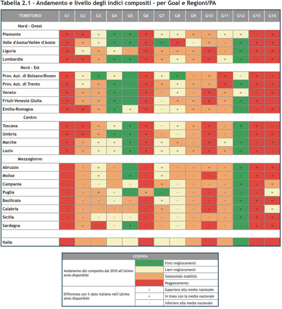 Il Rapporto, realizzato grazie al supporto incondizionato di AXA Italia e Federcasse, illustra lo stato e la dinamica dei territori italiani negli ultimi 14 anni, attraverso circa 100 indicatori elementari e indici compositi, mettendo in luce progressi, criticità e persistenti divari territoriali. In primo luogo, si conferma la presenza delle disuguaglianze Nord-Sud: povertà (G1), acqua (G6), qualità degli ecosistemi terrestri (G15) e giustizia e istituzioni (G16) mostrano un peggioramento in gran parte del Paese; mentre il Nord-Ovest e il Nord-Est registrano miglioramenti significativi nell’istruzione (G4), a fronte di una sostanziale stabilità nelle altre aree (vedi Tabella 2.1). Allo stesso tempo, per alcuni Goal un numero significativo di Regioni del Mezzogiorno mostra livelli vicini o superiori alla media nazionale – energia (G7), economia circolare (G12), vita sulla terra (G15) e giustizia e istituzioni (G16), segnalando la presenza di esperienze positive anche nelle aree considerate più fragili.