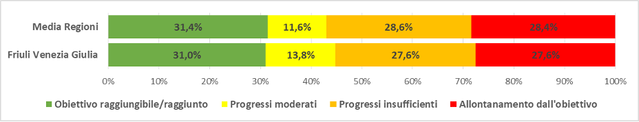 Nella Regione Friuli Venezia Giulia, se i trend di breve periodo (ultimi 3-5 anni) dovessero essere confermati nei prossimi anni il 31% dei 29 obiettivi quantitativi risulterebbe raggiungibile/raggiunto, mentre il 14% presenta progressi moderati e il 55% progressi insufficienti o un allontanamento dagli obiettivi.