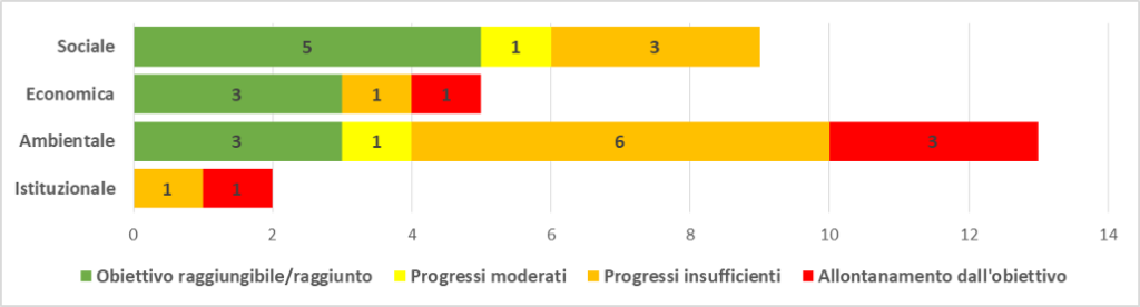 L’analisi relativa alle quattro dimensioni evidenzia le maggiori criticità per quella istituzionale dove nessun obiettivo risulta raggiungibile/raggiunto. Anche la dimensione ambientale mostra criticità, con solo tre obiettivi su tredici risultano raggiungibili. Migliore appare la situazione delle dimensioni economica e sociale con, rispettivamente, tre obiettivi su cinque e cinque obiettivi su nove che risultano raggiungibili/raggiunti.