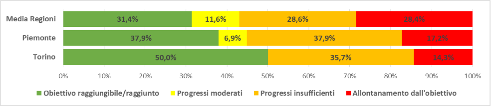 Nella Regione Piemonte, se i trend di breve periodo (ultimi 3-5 anni) dovessero essere confermati, nei prossimi anni il 38% dei 29 obiettivi quantitativi risulterebbe raggiungibile/raggiunto, mentre per il 7% si registrano progressi moderati. Infine, il 38% mostra progressi insufficienti e il 17% si sta allontanamento dagli obiettivi.