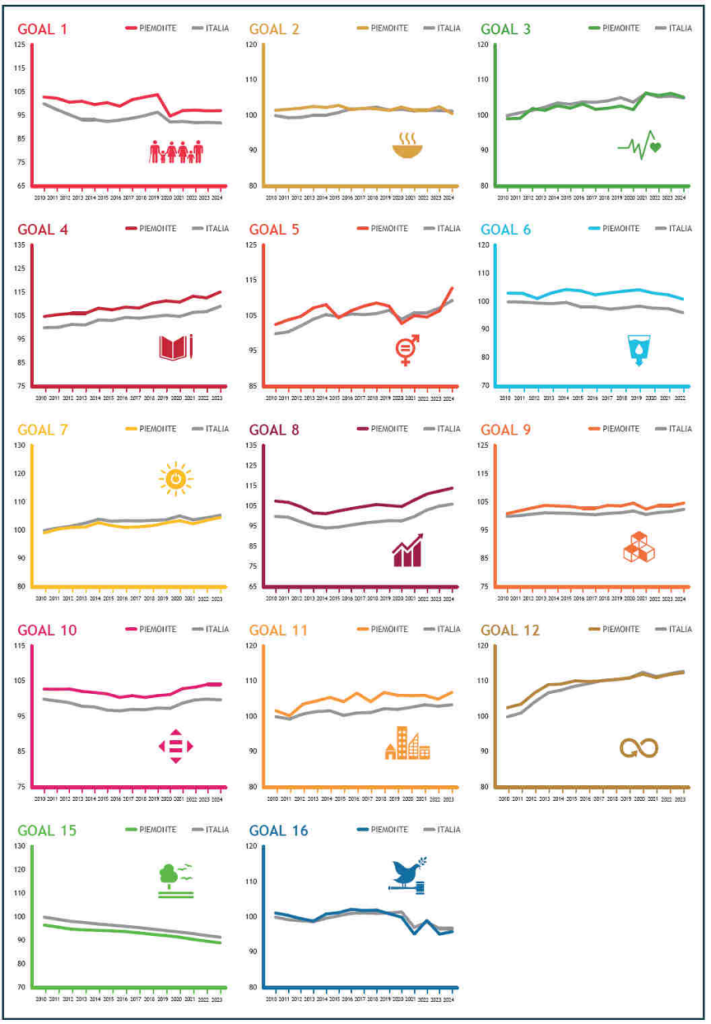 Il Piemonte, tra il 2010 e il 2024, mostra miglioramenti per salute (Goal 3), istruzione (Goal 4), parità di genere (Goal 5), energia (Goal 7), lavoro e crescita (Goal 8), città e comunità (Goal 11), consumo e produzione responsabili (Goal 12). Peggiora la situazione di povertà (Goal 1), agricoltura e alimentazione (Goal 2), acqua pulita e servizi igienico sanitari (Goal 6), vita sulla terra (Goal 15) e giustizia e istituzioni (Goal 16).