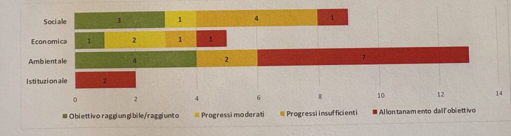 L’analisi regionale relativa alle quattro dimensioni evidenzia le maggiori criticità nella dimensione ambientale dove, a fronte dei quattro obiettivi raggiungibili, sette obiettivi risultano essere in allontanamento e due con progressi insufficienti. La dimensione sociale è complessivamente quella più positiva, con tre obiettivi che risultano raggiungibili/raggiunti e uno con progressi significativi.