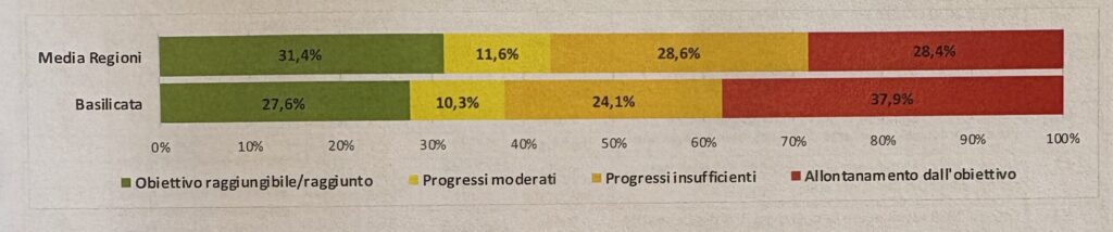 Nella Regione Basilicata, se i trend di breve periodo (ultimi 3-5 anni) dovessero essere confermati, nei prossimi anni il 28% dei 29 obiettivi quantitativi risulterebbe raggiungibile/raggiunto. Il 24% presenta progressi insufficienti e per il 38% si sta allontanando dagli obiettivi.