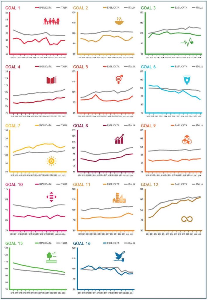 La Basilicata, tra il 2010 e il 2024, mostra miglioramenti per Energia (Goal 7), Istruzione (Goal 4), Lavoro e crescita economica (Goal 8), consumo e produzione responsabili (Goal 12). Peggiora la situazione di povertà (Goal 1), acqua pulita e servizi igienico sanitari (Goal 6), disuguaglianze (Goal 10), vita sulla terra (Goal 15) e giustizia e istituzioni (Goal 16).