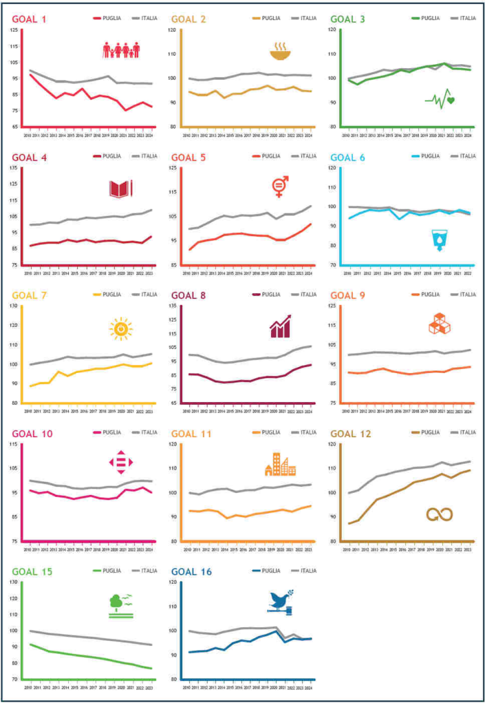 La Puglia, tra il 2010 e il 2024, mostra miglioramenti per istruzione (Goal 4), parità di genere (Goal 5), energia (goal 7), Lavoro e crescita economica (G8), consumo e produzione responsabili (Goal 12) e giustizia e istituzioni (Goal 16). Peggiora la situazione di povertà (Goal 1), disuguaglianze (Goal 10), vita sulla terra (Goal 15).