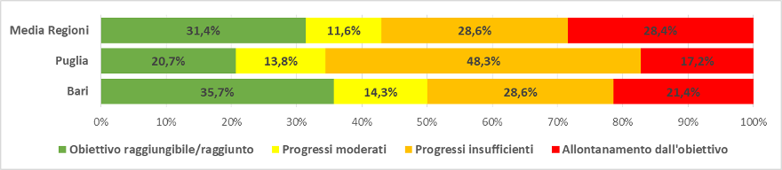 Per la CM di Bari quasi il 36%, dei 14 obiettivi analizzati risultano raggiungibili/raggiunti, Il 29% presenta progressi insufficienti e il 21% registra un allontanamento dai target.