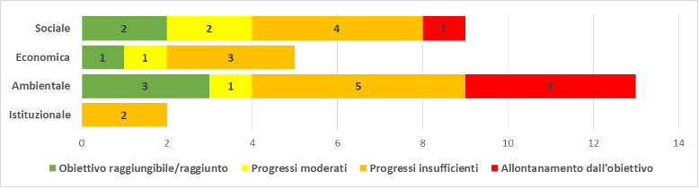 L’analisi relativa alle quattro dimensioni mostra criticità in tutte. Nella dimensione economica un solo obiettivo su cinque risulta raggiungibile/raggiunto. Anche la situazione relativa alla dimensione sociale è critica, raggiungibili due obiettivi su tredici. Per la dimensione istituzionale nessun obiettivo risulta raggiungibile/raggiunto.
