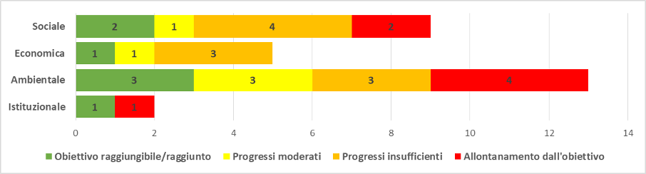 L’analisi relativa alle quattro dimensioni evidenzia le maggiori criticità per quella economica e per quella sociale dove, rispettivamente, solo un obiettivo su quattro e due su nove risultano raggiungibili/raggiunti. Anche la situazione relativa alla dimensione ambientale mostra delle criticità: gli andamenti analizzati permetterebbero di raggiungere solo tre obiettivi su tredici.