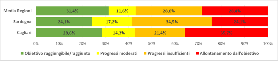 La CM di Cagliari riporta i seguenti risultati per i 14 obiettivi analizzati: il 29% è raggiungibile/raggiunto, il 57% registra, complessivamente, progressi insufficienti o è in allontanamento dal target.