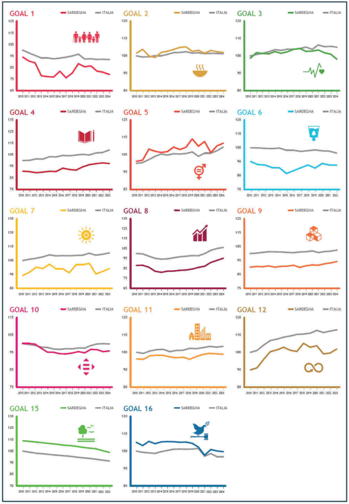 La Sardegna, tra il 2010 e il 2024, mostra miglioramenti per istruzione (Goal 4), parità di genere (Goal 5), Lavoro e crescita economica (G8), consumo e produzione responsabili (Goal 12). Peggiora la situazione di povertà (Goal 1), salute (Goal 3), acqua pulita e servizi igienico sanitari (Goal 6), disuguaglianze (Goal 10), vita sulla terra (Goal 15) e giustizia e istituzioni (Goal 16).