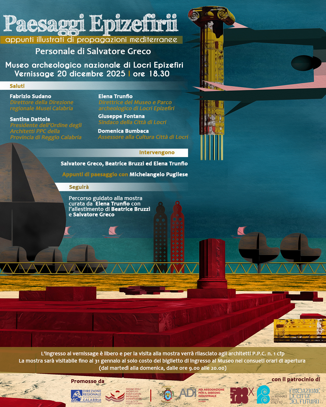 Sarà inaugurata il 20 dicembre, dalle ore 18.30 presso il Museo archeologico, “Paesaggi Epizefirii: appunti illustrati di propagazioni mediterranee” la mostra di Salvatore Greco, a cura di Elena Trunfio con l’allestimento di Salvatore Greco e Beatrice Bruzzì. L’esposizione, visitabile fino al 31 gennaio, è promossa insieme all’Ordine degli Architetti PPC della Provincia di RC e con il patrocinio del comune di Locri, Associazione per il Disegno Industriale – Sez. Calabria, 500X100, la Biennale dello Stretto e Fondazione Le città del futuro.