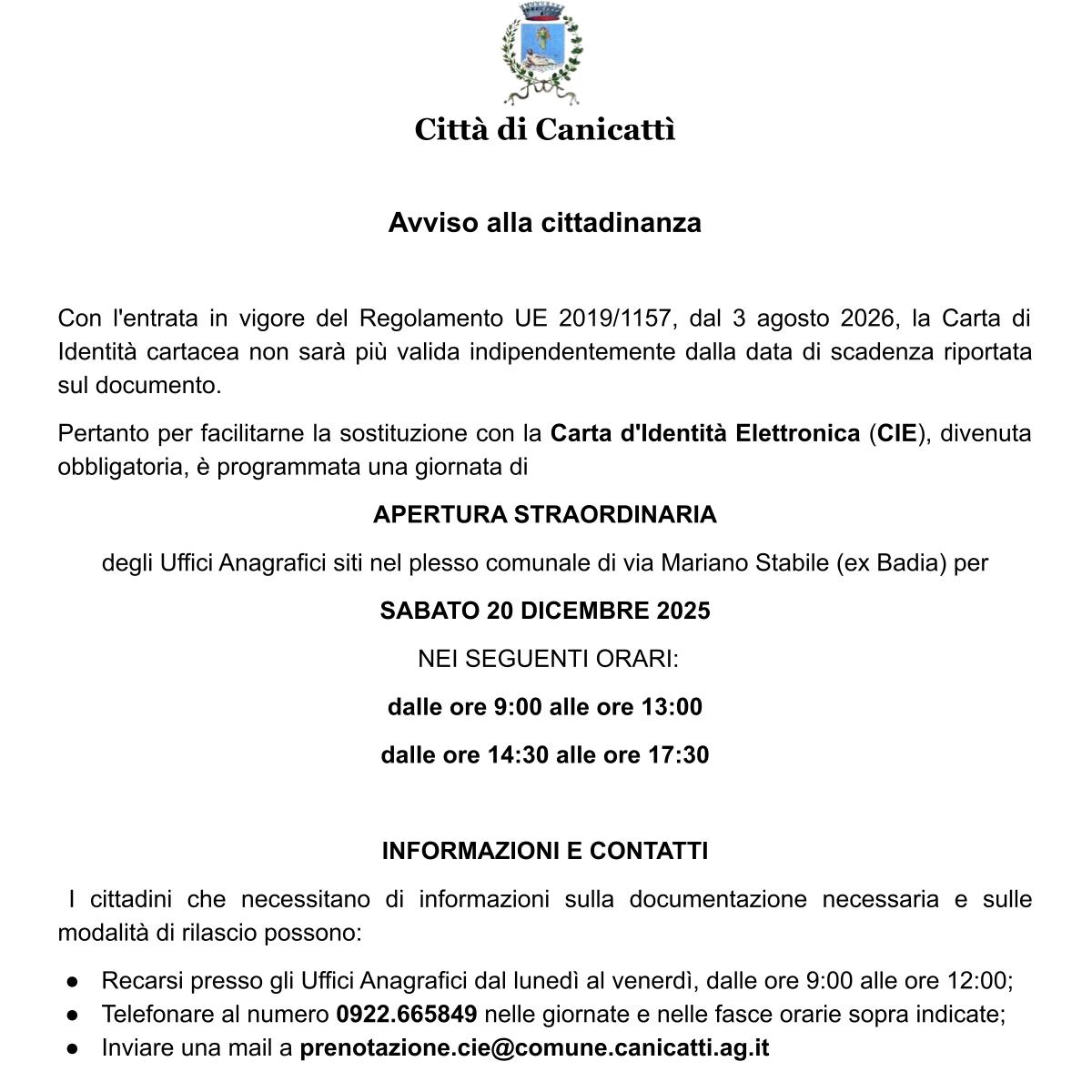 In attuazione della direttiva del Sindaco e dell’Assessore al ramo, è programmata una giornata di apertura straordinaria per facilitare la sostituzione delle carte d’identità cartacee con la Carta d’Identità Elettronica (CIE).