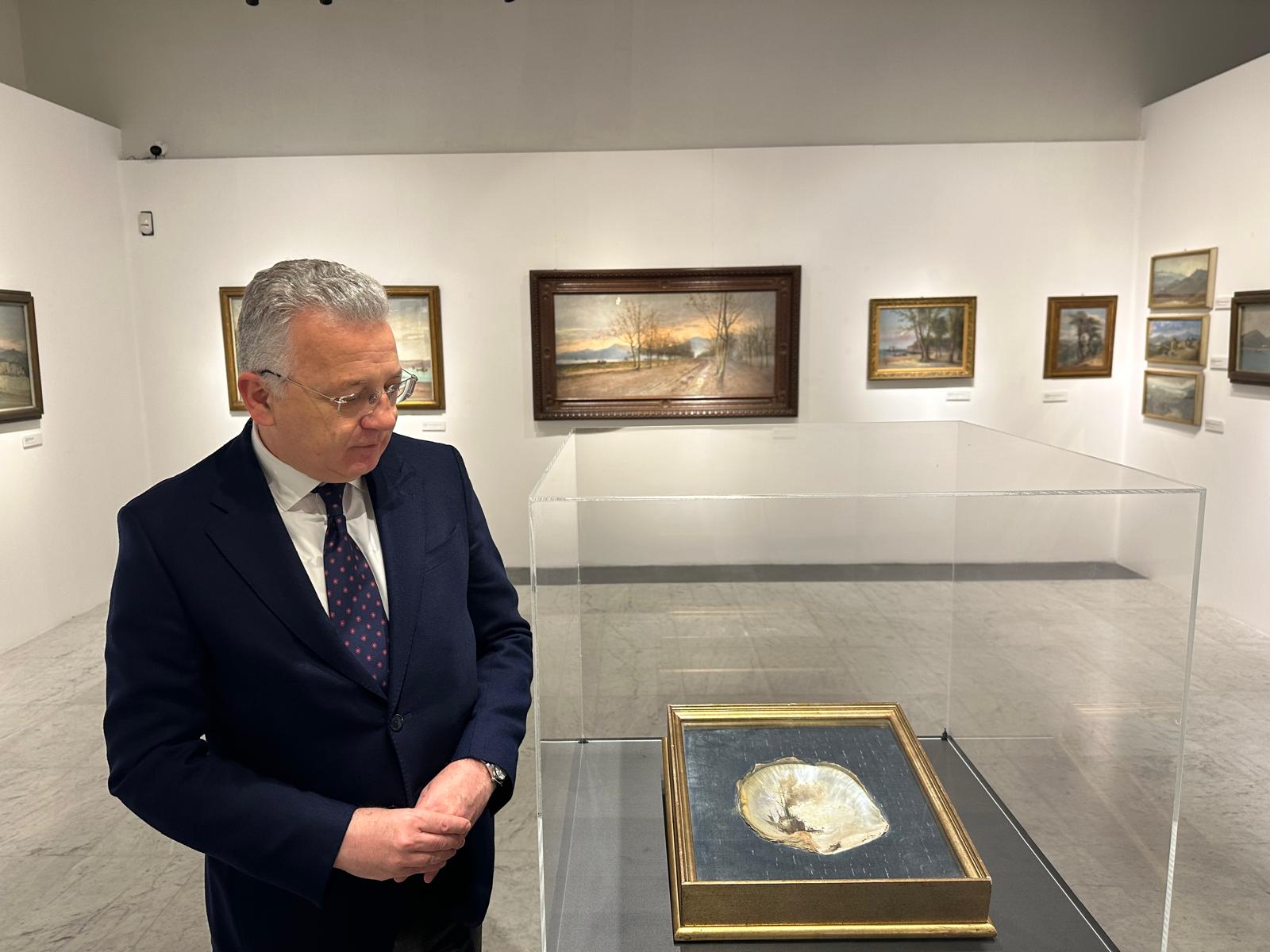 Il significativo dipinto del celebre maestro Agostino Fossati consta di un paesaggio marino con imbarcazione, realizzato con la tecnica della pittura su madreperla di conchiglia che arricchisce la mostra permanente di dedicata al maestro spezzino. L’opera costituisce una preziosa aggiunta al patrimonio civico poiché è l’unico lavoro di Fossati su conchiglia in madreperla finora assente dalla collezione permanente.