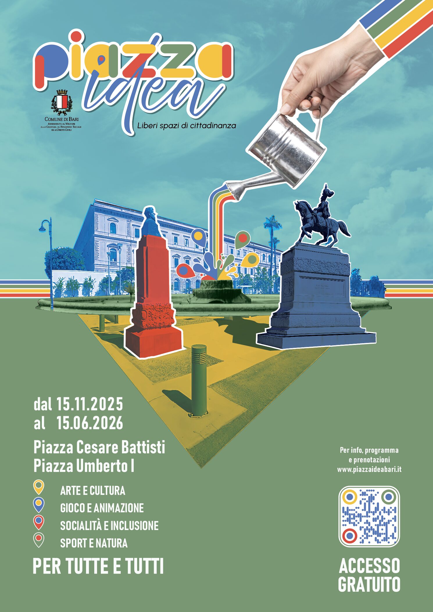 “Piazza Idea” è il programma dell’amministrazione comunale finalizzato all’animazione e inclusione sociale delle due piazze centrali della città, per contrastare fenomeni di degrado e marginalità sociale e restituire vivibilità e sicurezza attraverso la presenza positiva di cittadini, famiglie, bambini e studenti, promuovendo al contempo percorsi educativi, culturali e creativi capaci di rafforzare il senso di comunità e di valorizzare gli spazi pubblici come luoghi di incontro intergenerazionale.