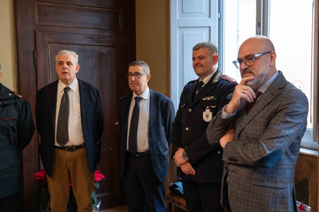 Presenti all’appuntamento il sindaco di Macerata Sandro Parcaroli, il Procuratore Giovanni Fabrizio Narbone, il Presidente del Tribunale Paolo Vadalà, il Vicario del Questore Marcello Pedrotti, il Presidente di Confartigianato Enzo Mengoni, il Direttore dell’Accademia di Belle Arti di Macerata Piergiorgio Capparucci, oltre al Colonnello dei Carabinieri Massimiliano Mengasini, il Tenente Colonnello della Guardia di Finanza Francesco Mirarchi e il Comandante della Polizia locale Danilo Doria. Numerosi anche i dirigenti e i delegati degli istituti scolastici, tra cui il Dirigente Simone Cartuccia per il Liceo Classico “Giacomo Leopardi”, il Dirigente dell’IIS “F. Filelfo” di Tolentino Donato Romano, la Coadiutrice del Dirigente Scolastico dell’ITE “Gentili” Cinzia Cecchini, la rappresentante dell’Ufficio Scolastico Provinciale dell’Ambito Territoriale di Macerata Roberta Lattanzi.
