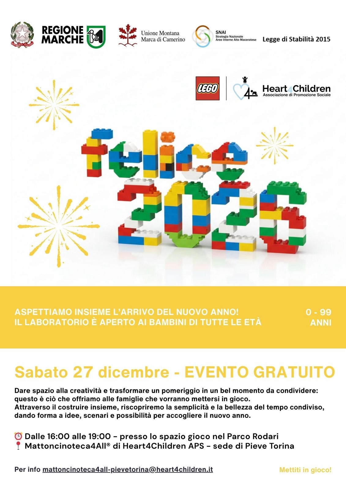 La magia del Natale porta a Pieve Torina tante nuove iniziative. Sabato 27 dicembre, alla Mattoncinoteca4All® di Heart4Children APS nei locali della sala Rubner, prenderà il via un laboratorio aperto ai bambini di tutte le età (e non solo) dal titolo “Aspettando il nuovo anno”.