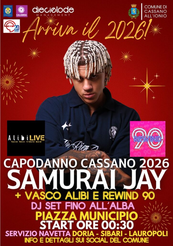 A Cassano il Capodanno parla ai giovani nel segno della musica e della sicurezza. Special guest: Samurai Jay. Ad aprire la serata lo show Rewind 90 e Alibi, cover di Vasco. Poi dj set fino all’alba.