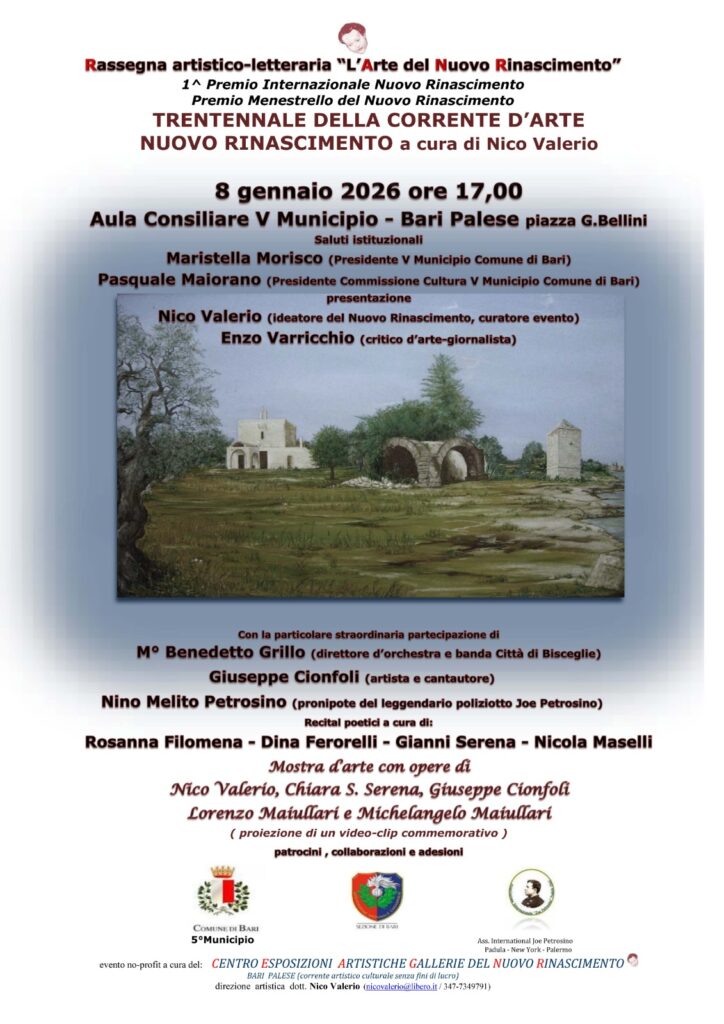 Si svolgerà domani, giovedì 8 gennaio, dalle ore 17 nell’aula consiliare del Municipio V (piazza Bellini), l’evento dedicato al “Trentennale del Nuovo Rinascimento”, con l’apertura della mostra d’arte curata da Nico Valerio (grafico, pittore e scrittore) ed esibizioni musicali e poetiche.