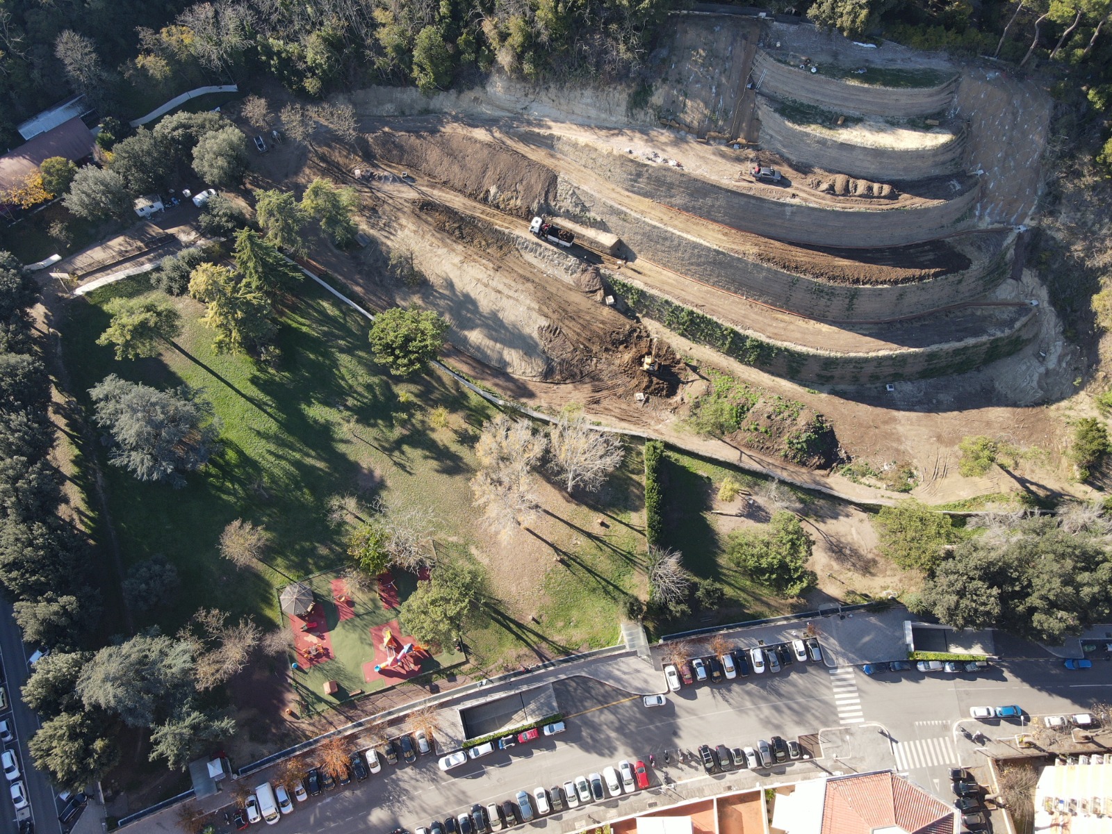 Roma Capitale ha avviato un intervento strutturale di ricostruzione e consolidamento del versante, basato su un sistema di terre rinforzate, una tecnica di ingegneria naturalistica che consente di ripristinare la morfologia del pendio garantendone al tempo stesso la stabilità. Il progetto ha previsto il collettamento delle acque meteoriche in fognatura e la sistemazione del verde, per reintegrare l’area nel contesto paesaggistico. Le opere strutturali risultano oggi di fatto completate, resta da eseguire esclusivamente l’idrosemina. La fine dei lavori è prevista entro febbraio.
