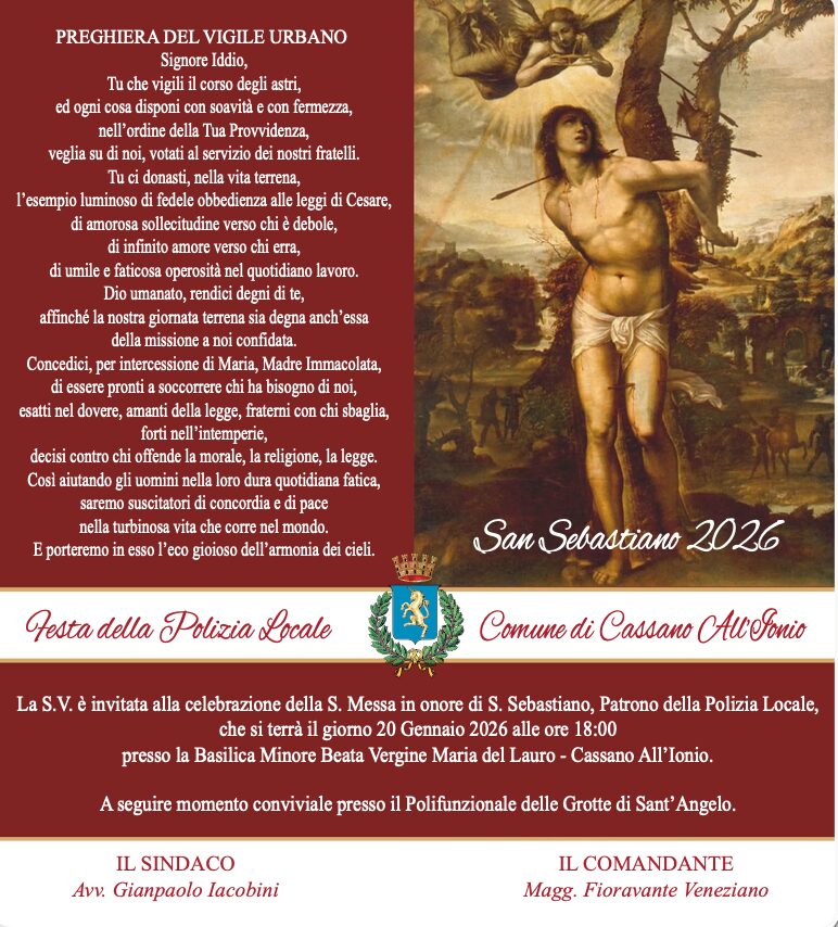 CASSANO ALL’IONIO – In occasione della ricorrenza di San Sebastiano, martire e Patrono della Polizia Locale, l’Amministrazione Comunale e il Comando di Polizia Locale di Cassano All’Ionio annunciano le celebrazioni ufficiali previste per domani 20 gennaio 2026.