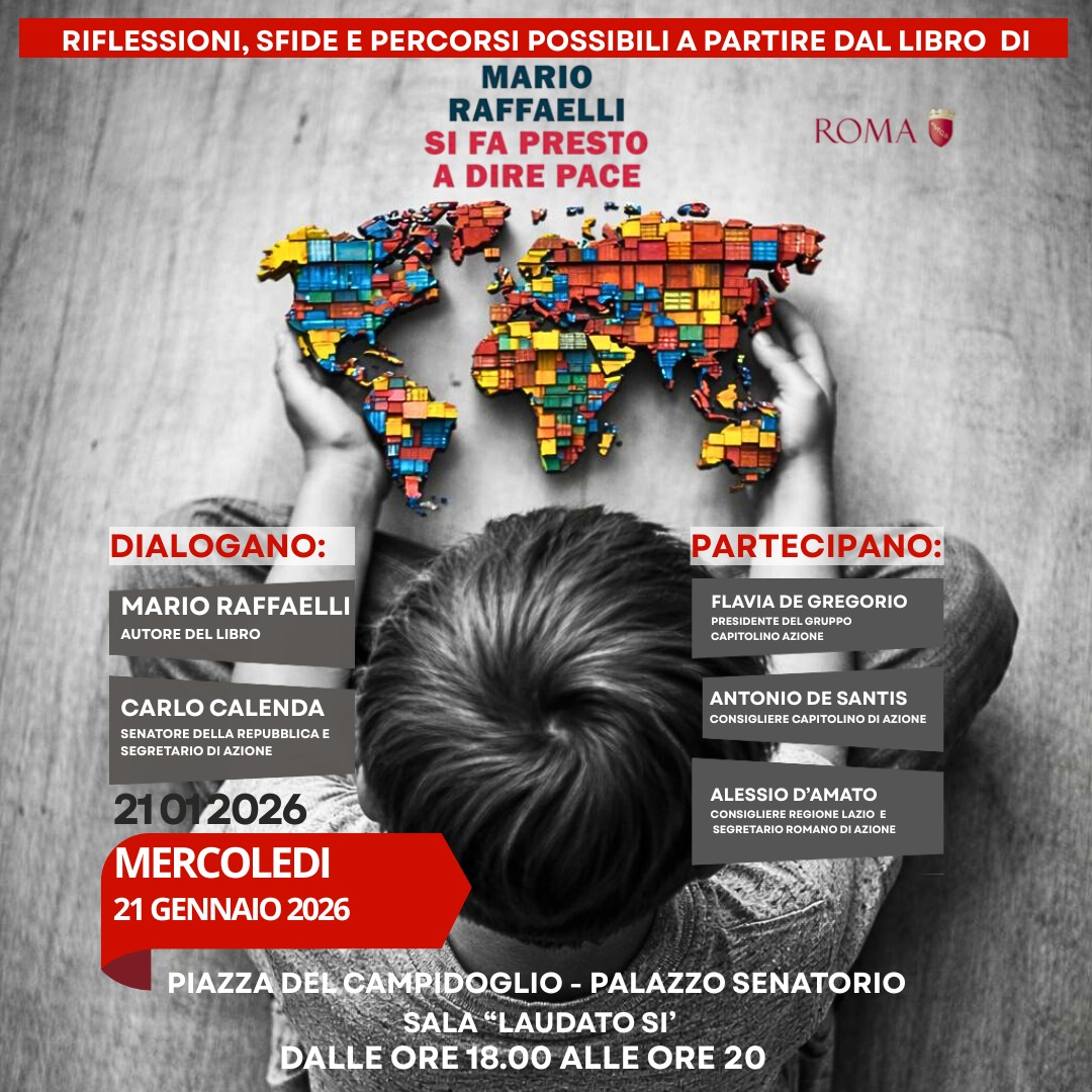 All’evento prenderanno parte, accanto a Flavia De Gregorio e Antonio De Santis, capogruppo e consigliere di Azione in Campidoglio, Carlo Calenda, senatore e segretario di Azione, Alessio D’Amato, consigliere di Azione in Regione Lazio e segretario romano di Azione, e Mario Raffaelli, autore del libro.
