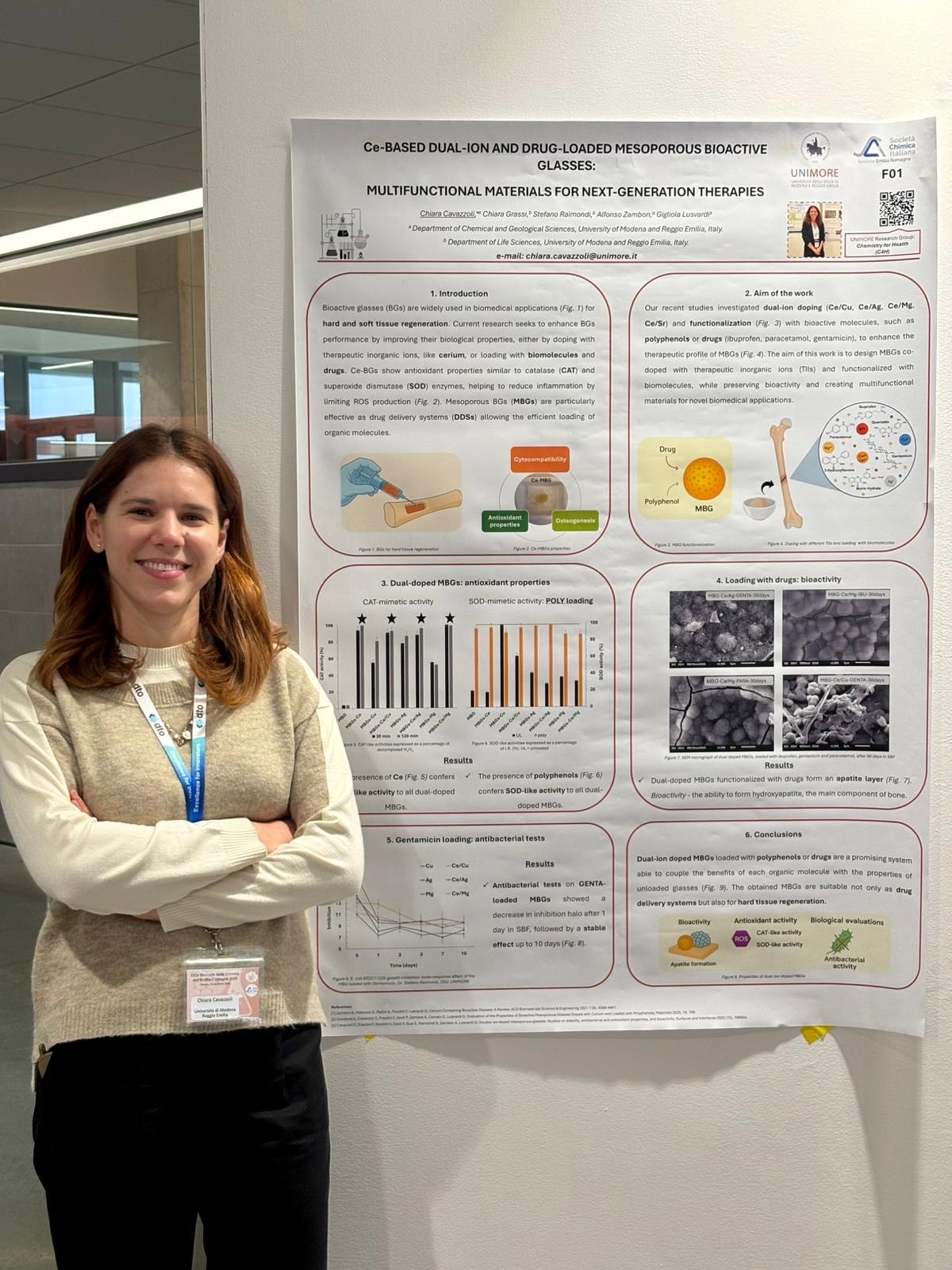 Chiara Cavazzoli ha ottenuto il secondo posto per la “Miglior Presentazione Flash” in occasione della XXIV Giornata della Chimica dell’Emilia-Romagna 2025, svoltasi a Ferrara il 18 dicembre 2025. La ricerca premiata, svolta sotto la supervisione della prof.ssa Gigliola Lusvardi, tutor della candidata, è dedicata allo sviluppo di vetri bioattivi mesoporosi caricati con ioni terapeutici e farmaci, concepiti come materiali multifunzionali per terapie di nuova generazione.