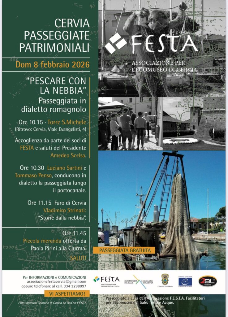 L’Associazione Festa m, nell’ambito delle proprie attività di promozione della cultura immateriale, così come proposto dalla convenzione di Faro, organizza per domenica 9 Febbraio 2026 una passeggiata patrimoniale dedicata all’attività della pesca nelle giornate di nebbia. La passeggiata sarà condotta in dialetto romagnolo col seguente programma: alle 10:15 ritrovo presso Torre San Michele in viale Evangelisti 4 e, dopo il saluto del presidente Amedeo Scelsa e l’accoglienza da parte dei soci di Festa, la passeggiata si avvierà lungo il porto canale con la conduzione di Luciano Sartini e Tommaso Penso. Giunti al Faro di Cervia, ci sarà l’animazione “Storie dalla nebbia” di e con Vladimiro Strinati. E per terminare alle 11:45 piccola merenda offerta da Paola Pirini alla Ciurma. Lo strumento della passeggiata patrimoniale viene proposto come occasione di incontro con la cultura di una comunità e con i testimoni, cioè uomini e donne che hanno o hanno avuto conoscenze peculiari di un sapere che ha formato la comunità stessa. Festa, che è nata con l’Ecomuseo del sale del mare, intende con questi strumenti avvicinare nuovi pubblici alla cultura attraverso linguaggi e contenuti poco conosciuti.