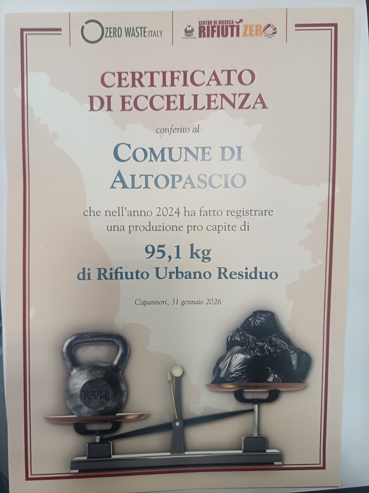 Altopascio, 7 febbraio 2026 – Il Comune di Altopascio ha ricevuto il Certificato di eccellenza per i risultati ottenuti nella riduzione del rifiuto urbano residuo (Rur – non riciclabile), un riconoscimento assegnato nell’ambito del monitoraggio annuale promosso da Zero Waste Italy e dal Centro di ricerca rifiuti zero, che analizzano e certificano le performance ambientali dei Comuni italiani sulla base di dati ufficiali e indicatori oggettivi legati alla produzione dei rifiuti.