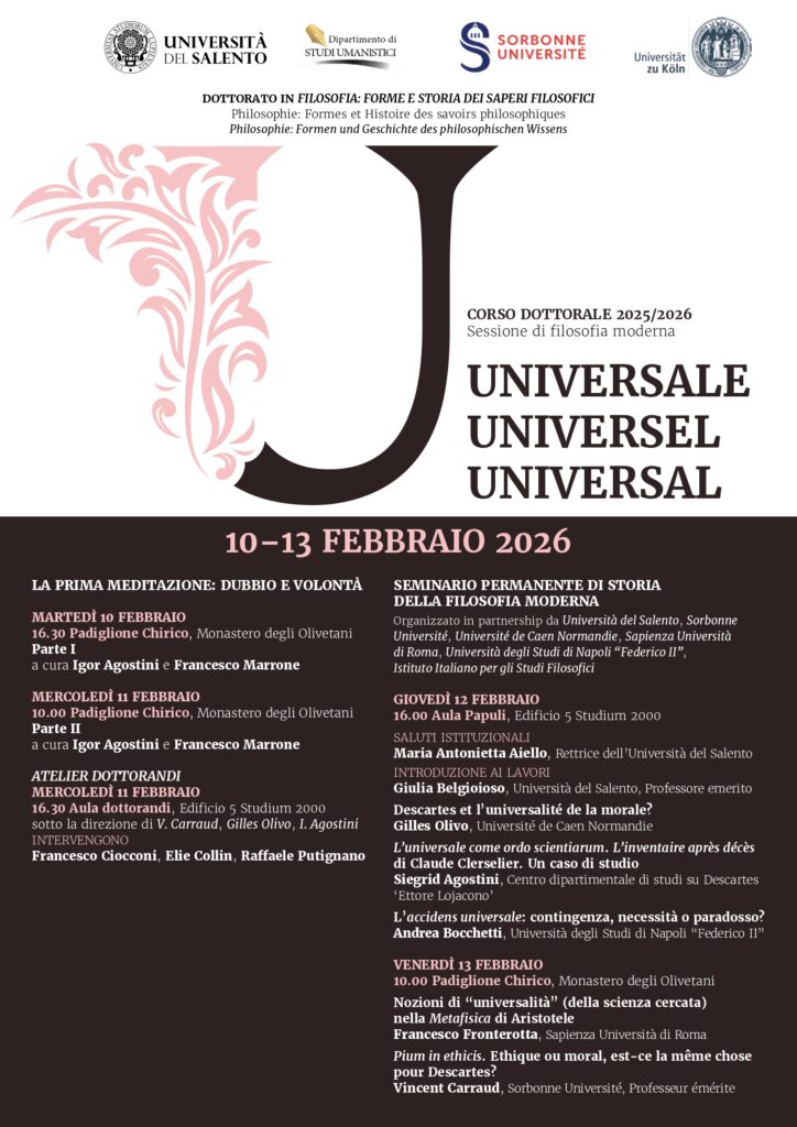 Dal 10 al 13 febbraio all’Università del Salento si terrà la sessione di filosofia moderna del Dottorato in Filosofia intitolata “Universale / Universel / Universal”. La sessione si propone di indagare, da una prospettiva storica e teoretica, il problema dell’universalità nel pensiero filosofico moderno, attraverso un confronto interdisciplinare che coinvolge studiosi, ricercatori e dottorandi provenienti da diverse istituzioni accademiche italiane ed europee.