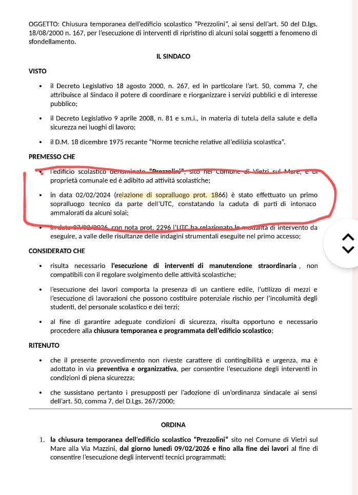senza indugio la sicurezza degli alunni vietresi e delle loro famiglie,