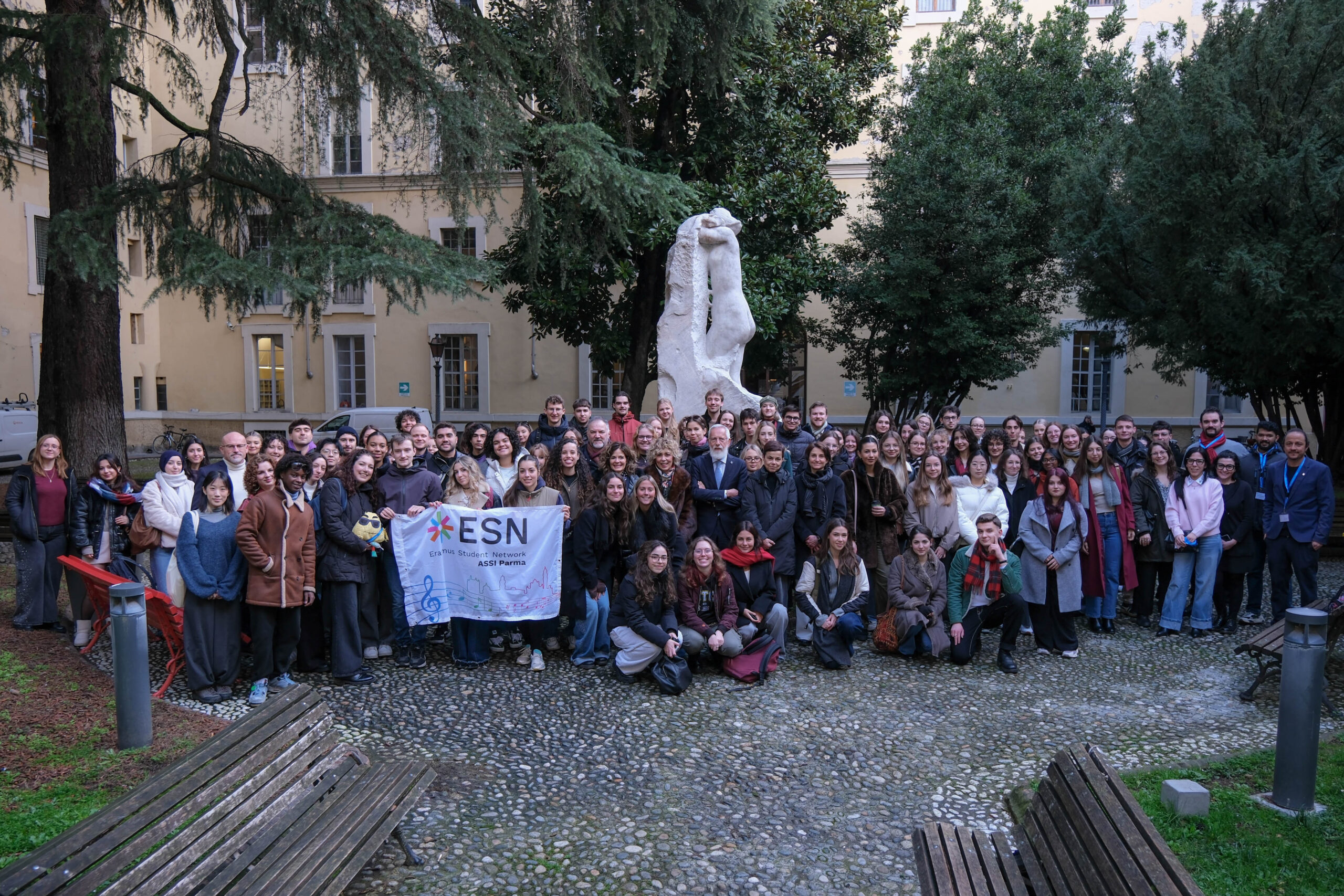 La giornata si è aperta con la tradizionale foto di gruppo nella Corte dell’Università, dove studentesse e studenti hanno incontrato il Rettore Paolo Martelli e l’Assessora alla Comunità Giovanile del Comune di Parma Beatrice Aimi.