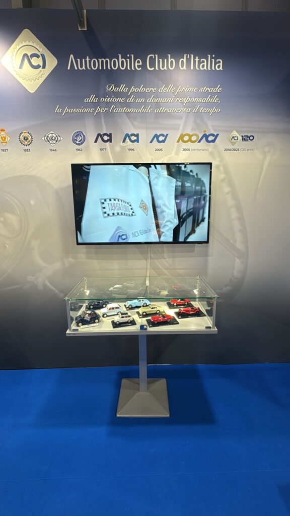 Nello stand ACI, infatti, è possibile ammirare 9 modellini esclusivi ed iconici di auto in scala, (provenienti dalla Biblioteca dell’ACI di Roma che conta più di 800.000 pagine digitalizzate e oltre 5.000 volumi) quali, Fiat (124 Sport Spider 1400 del 1967; 500L Open Roof del 1968; 500 Giardiniera del 1960 e 600 Berline del 1963); e Alfa Romeo (6C 1750 GS Zagato del 1930; 8C 2900 B Lungo Touring del 1938; 6C 2500 SS Villa D’Este del 1949; 1900 Disco Volante Spider del 1952 e 1900 Sprint del 1951).