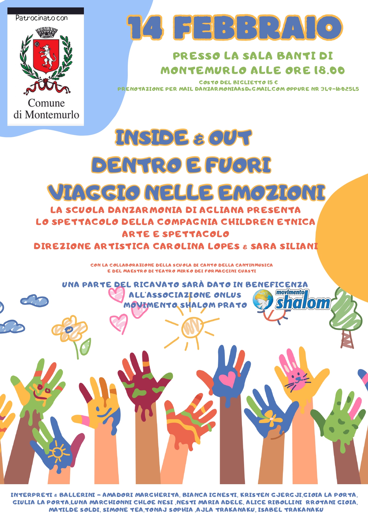 MONTEMURLO 11/02/2026 – In occasione della giornata di San Valentino, il cuore di Montemurlo batterà a ritmo di danza e solidarietà. Sabato 14 febbraio alle ore 18 il teatro della Sala Banti ospiterà lo spettacolo “Inside & Out – Dentro e Fuori: Viaggio nelle Emozioni”. L’evento, organizzato dalla scuola Danzarmonia di Agliana con il patrocinio del Comune di Montemurlo, vedrà protagonista la Compagnia Children Etnica. Sotto la direzione artistica di Carolina Lopes e Sara Siliani, i giovani interpreti porteranno in scena un racconto coreografico che esplora i sentimenti umani, trasformando le emozioni in movimento.
