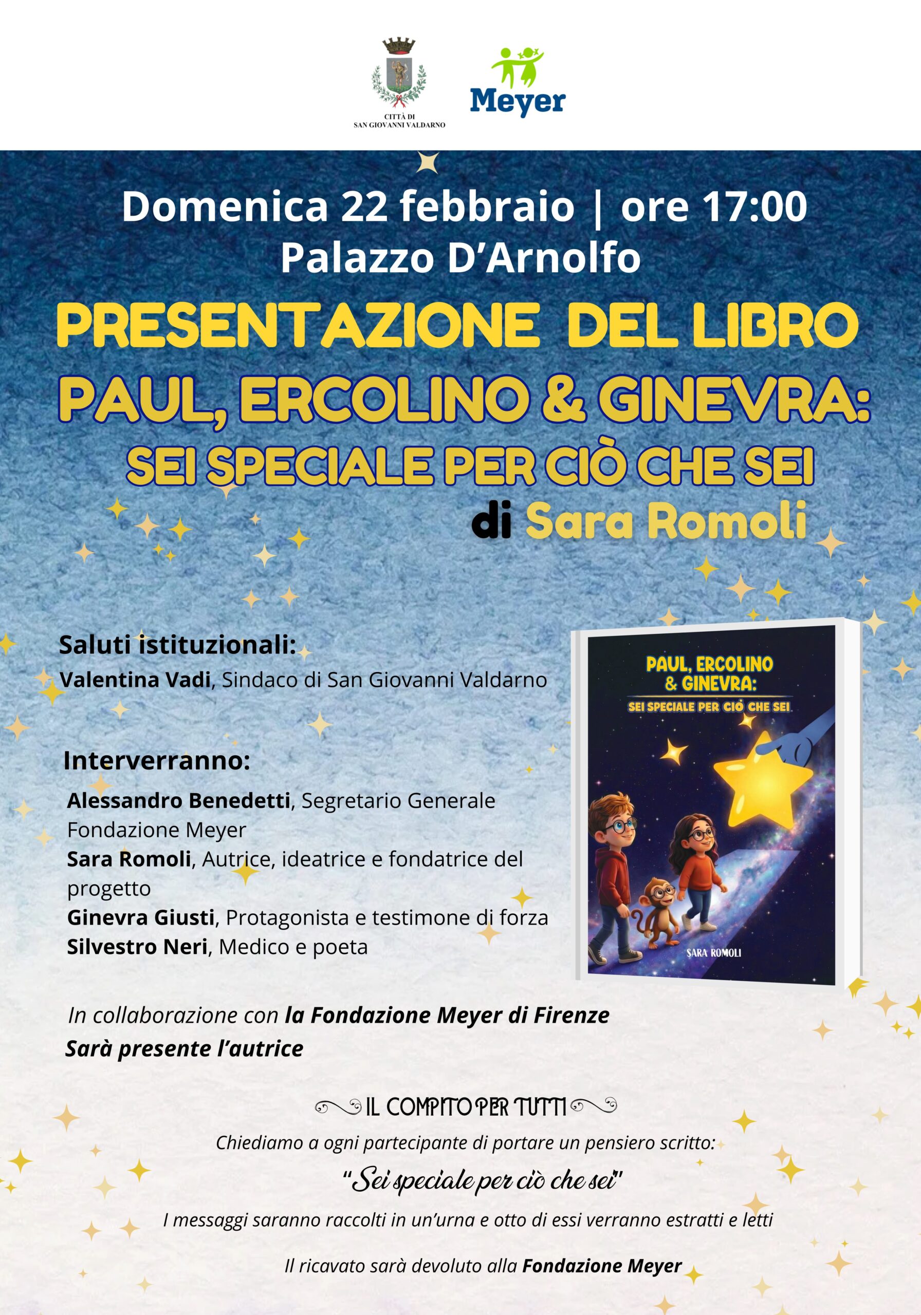 Un incontro che unisce il valore delle storie alla forza della solidarietà. Domenica 22 febbraio alle 17 Palazzo d’Arnolfo ospiterà la presentazione del libro “Paul, Ercolino & Ginevra: Sei speciale per ciò che sei” di Sara Romoli, un appuntamento promosso dal Comune di San Giovanni Valdarno in collaborazione con la Fondazione Meyer di Firenze, dedicato ai temi dell’inclusione, del coraggio e dell’unicità di ogni persona.