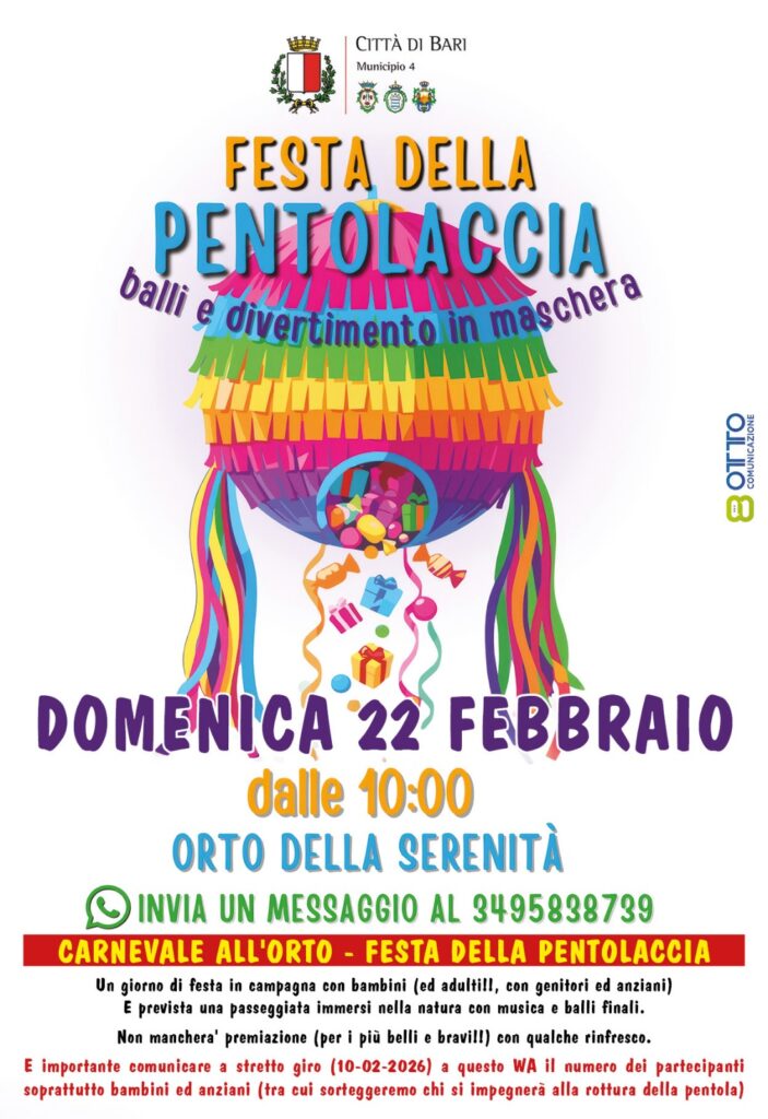 Un giorno di festa in campagna con bambini (ed adulti), genitori e anziani. È prevista una passeggiata immersi nella natura, con musica, balli finali e pentolaccia, con premiazione e momento conviviale. Previsto per martedì 17 febbraio, alle ore 10.00, si terrà domenica 22 febbraio, ore 10.00, all’Orto della Serenità.