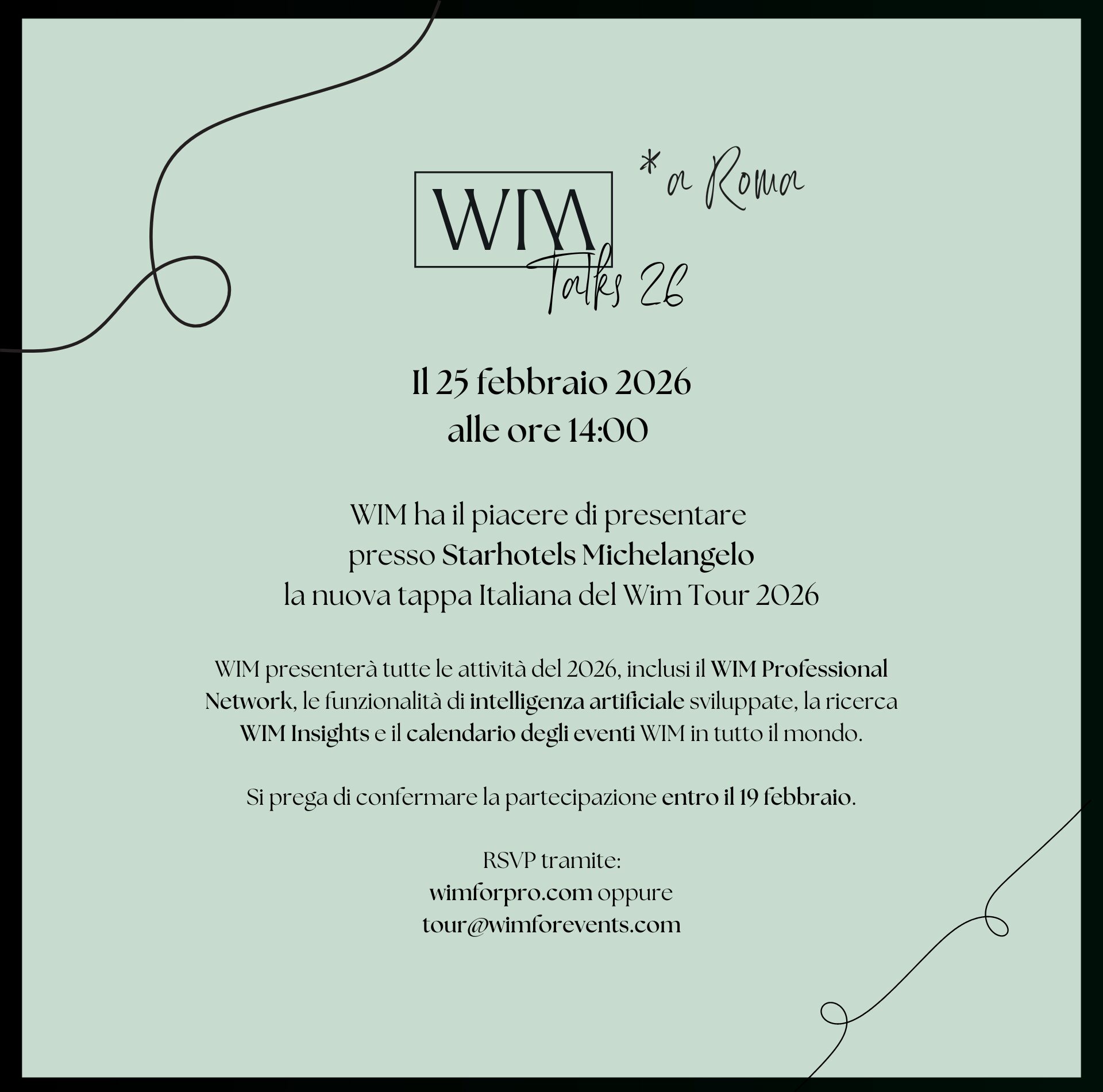 (AGENPARL) - Roma, 19 Febbraio 2026Dopo l’avvio del calendario italiano a Catania, il WIM Tour 2026 prosegue il suo percorso con la seconda tappa nazionale: il 25 febbraio a Roma presso lo Starhotels Michelangelo, prestigiosa struttura affacciata sul Vaticano e simbolo dell’hospitality d’eccellenza nel cuore della Capitale.