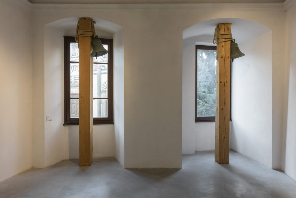 Nell’opera “Senza titolo” di Jannis Kounellis (1993-2009), due campane, esposte su pali di legno a cui sono ancorate saldamente con massicce corde di juta, rimandano all’estensione spaziale e sonora di un luogo di unione tra persone, sottolineato anche dall’utilizzo delle corde annodate. Un intenso dialogo con lo spazio che ristabilisce nuove chiavi di lettura e permette una costruzione spirituale e mentale al tempo stesso.