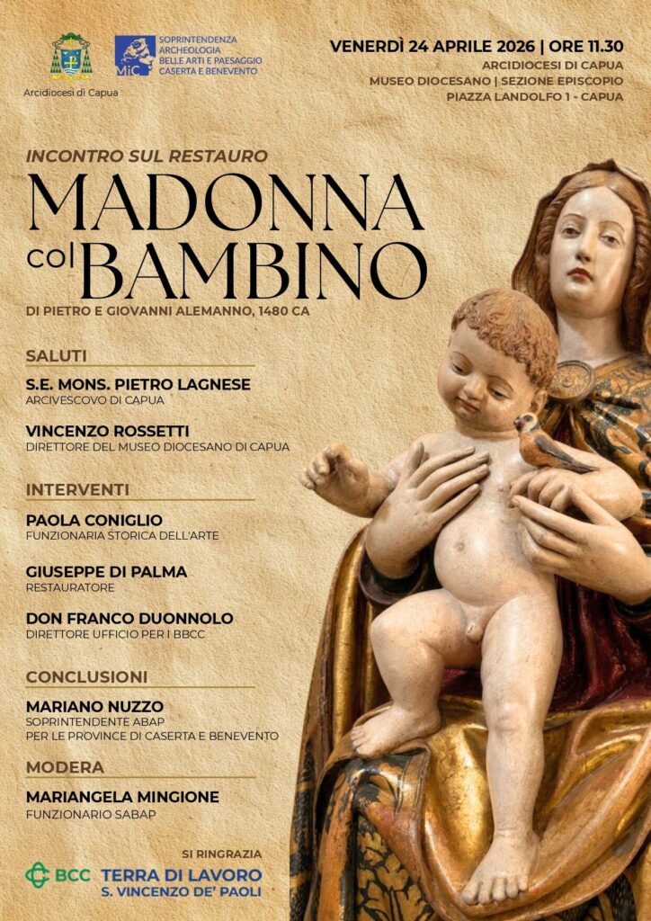 (AGENPARL) - Roma, 17 Aprile 2026 - La Soprintendenza Archeologia, Belle Arti e Paesaggio per le province di Caserta e Benevento è lieta di invitarLa a un incontro dedicato al rientro della pregevole scultura lignea policroma raffigurante la Madonna col Bambino, recentemente esposta alla mostra “Restituzioni 2025” tenutasi a Roma al Palazzo delle Esposizioni.