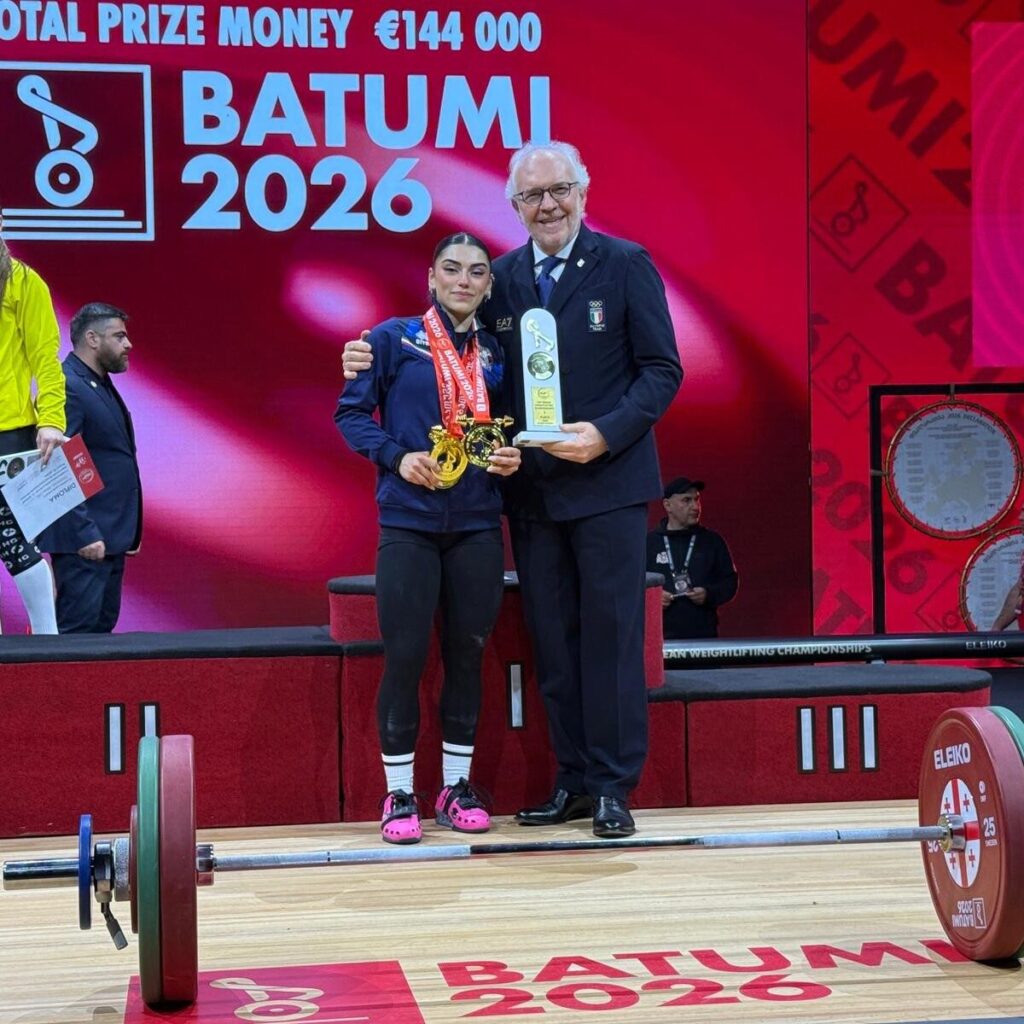 (AGENPARL) - Roma, 19 Aprile 2026 - Dopo due anni di assenza dalle pedane internazionali, Giulia Imperio torna più forte di prima, conquistando il titolo di Campionessa Europea nella categoria fino a 48 kili. Un titolo che le mancava dal 2022, quando vinse i Campionati Continentali in Albania con 171 kili e che ora torna ad essere suo a distanza di 4 anni, dopo un’operazione alla spalla e un lungo percorso di riabilitazione. L’Azzurra, che conquista il titolo Europeo sulla pedana di Batumi, in Georgia, si mette al collo tre medaglie d’oro: nello strappo con 78 kili, nello slancio con 98 kili e quindi anche nel totale con 176 kili.