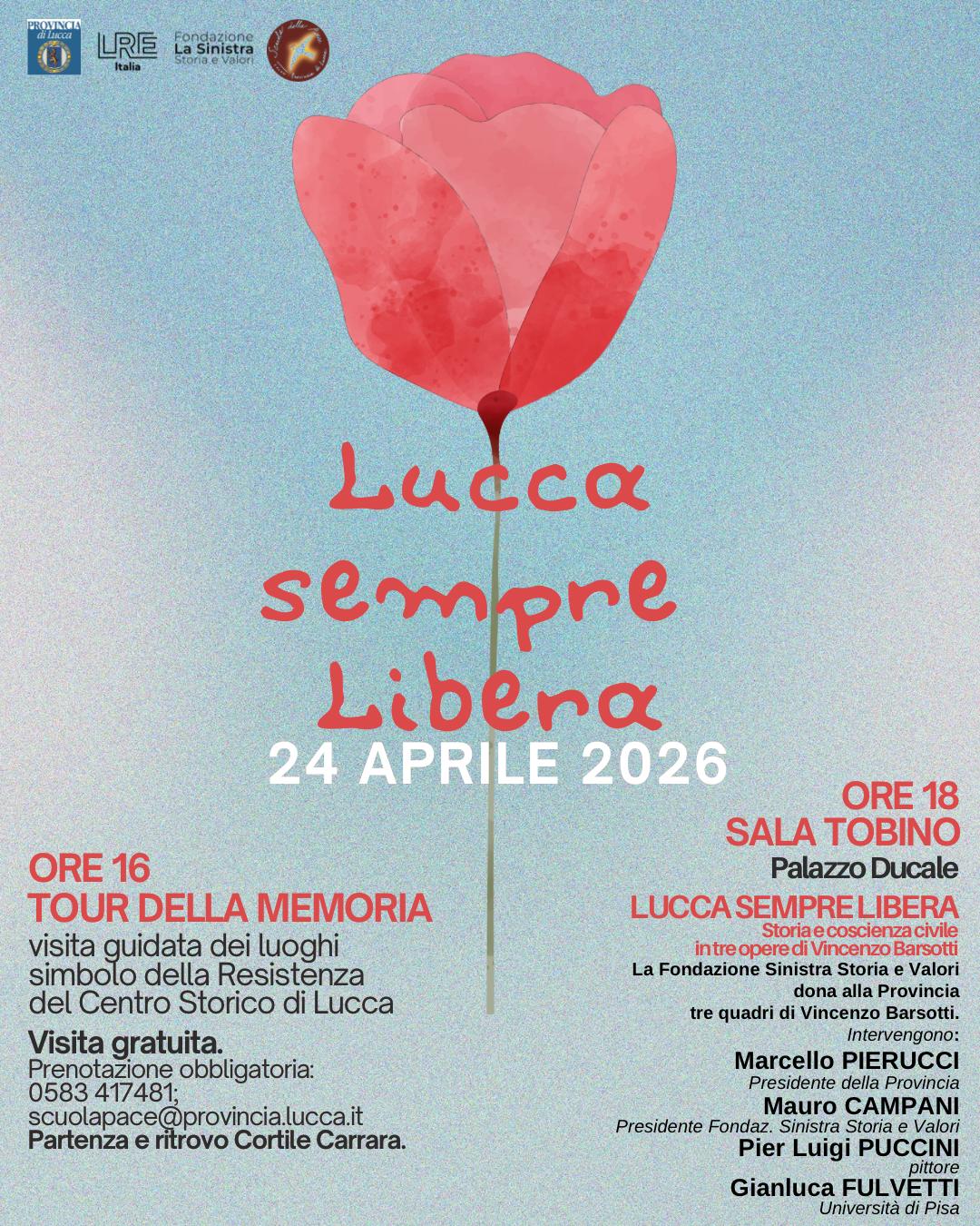 Doppio appuntamento targato Provincia di Lucca, il 24 aprile, sotto il segno della Libertà. Alle 16, infatti, è in programma il ‘Tour della Memoria’, una visita guidata dei luoghi simbolo della Resistenza nel centro storico di Lucca, mentre, alle 18, in Sala Tobino, si svolgerà l’incontro ‘Lucca sempre libera. Storia e coscienza civile in tre opere di Vincenzo Barsotti’, nell’ambito della quale saranno presentati tre quadri del pittore lucchese, dati alla Provincia dalla Fonazione Sinistra Storia e Valori in comodato gratuito.