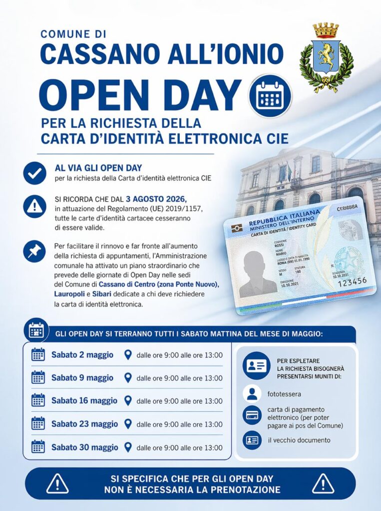 un *piano straordinario di aperture* nelle sedi comunali di *Cassano Centro