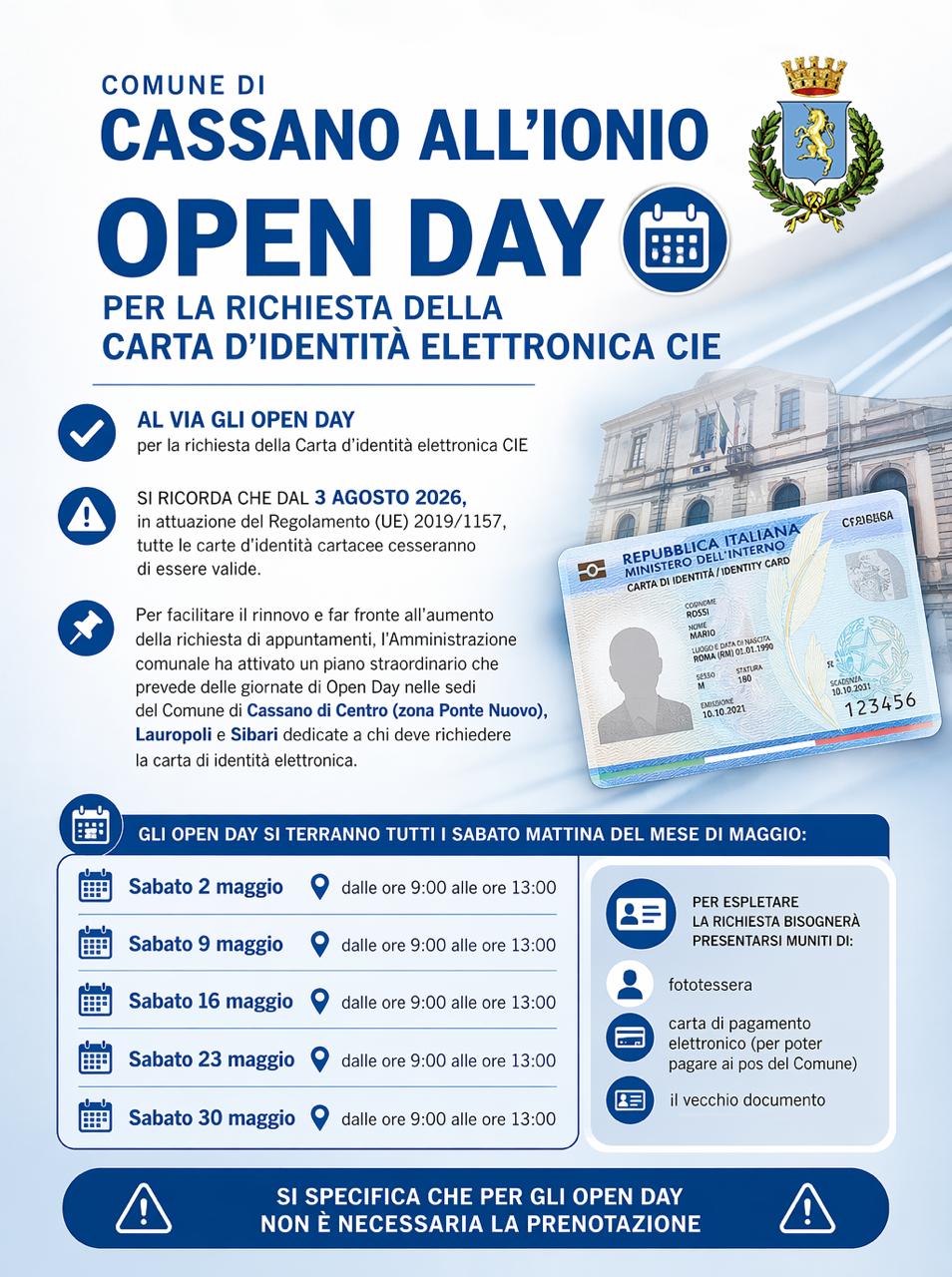 prenderanno il via gli *Open Day dedicati alla richiesta della Carta