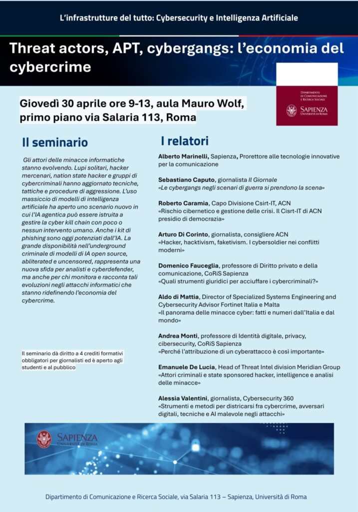 (AGENPARL) - Roma, 27 Aprile 2026 - Roma si prepara a ospitare un importante momento di confronto sul futuro della sicurezza digitale. Il 30 aprile, presso l’aula Mauro Wolf della Sapienza Università di Roma, si terrà il seminario “Threat actors, APT, cybergangs: l’economia del cybercrime”, un evento che riunisce accademici, esperti di cybersecurity, giornalisti e rappresentanti istituzionali.